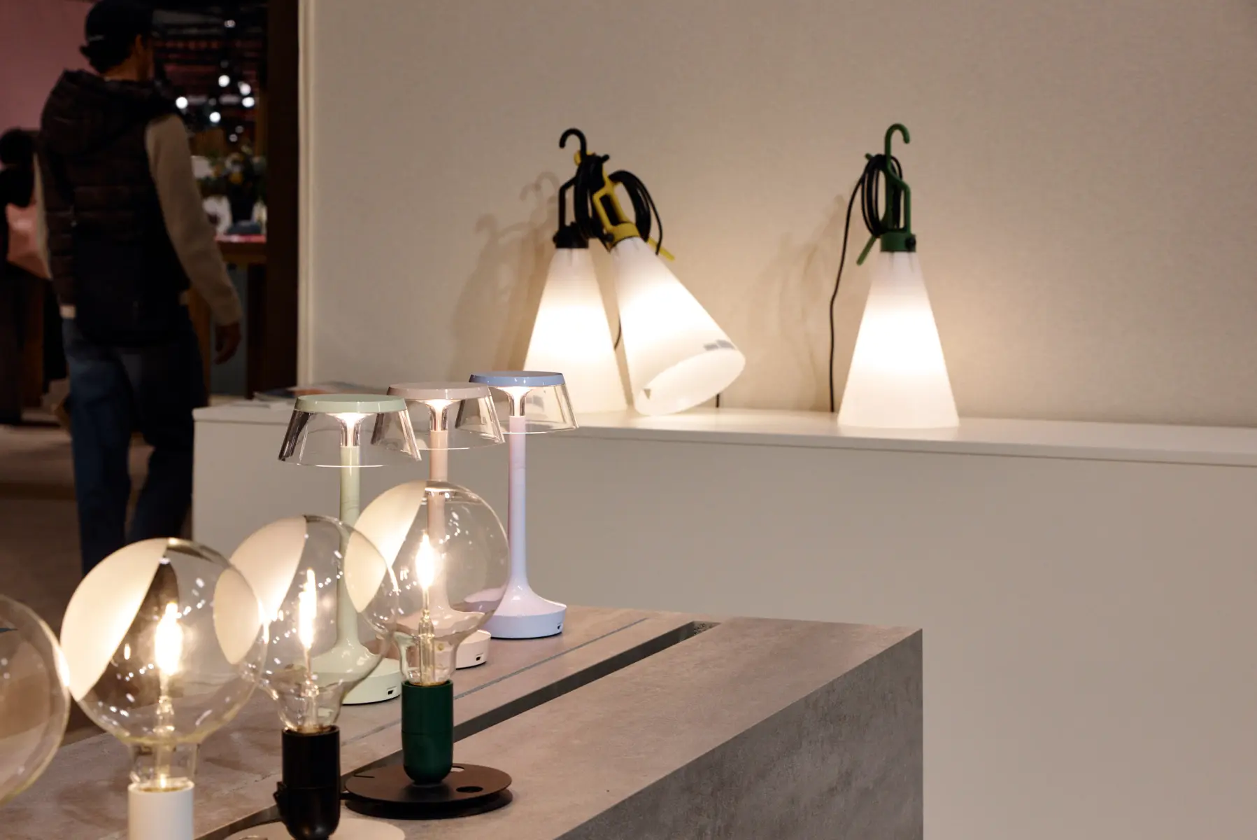 Connue pour ses lustres et lampadaires emblématiques, Flos met ici en lumière des objets pensés pour le quotidien et les concept stores, comme Bon Jour de Philippe Starck, Mayday de Konstantin Grcic ou Lampadina des frères Castiglioni, où l’usage reste au cœur de la création.