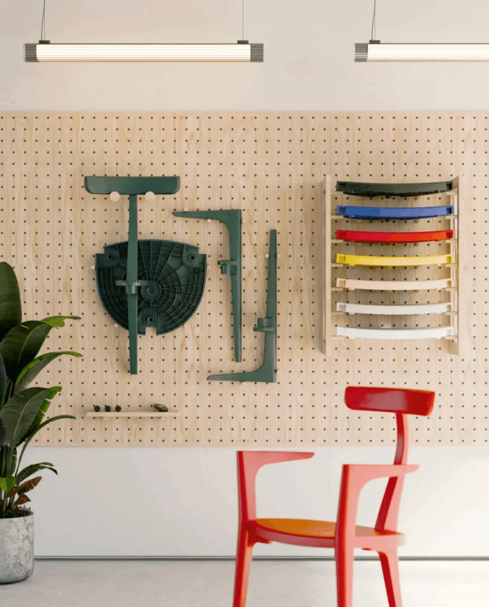 Polimair started with a simple idea: to look at recycled plastic differently. We wanted to work with this material to a very high standard, without compromise, and above all to change the way people see it. We design monomaterial kit furniture made exclusively in France from recycled plastic. Each piece is designed to be assembled and taken apart easily, without glue or additional materials. The Beluga chair, for example, is assembled with plastic screws, and the screwdriver is integrated directly beneath the seat. The kit allows individual parts to be replaced as needed. It is a simple system, with no steel and no virgin material.