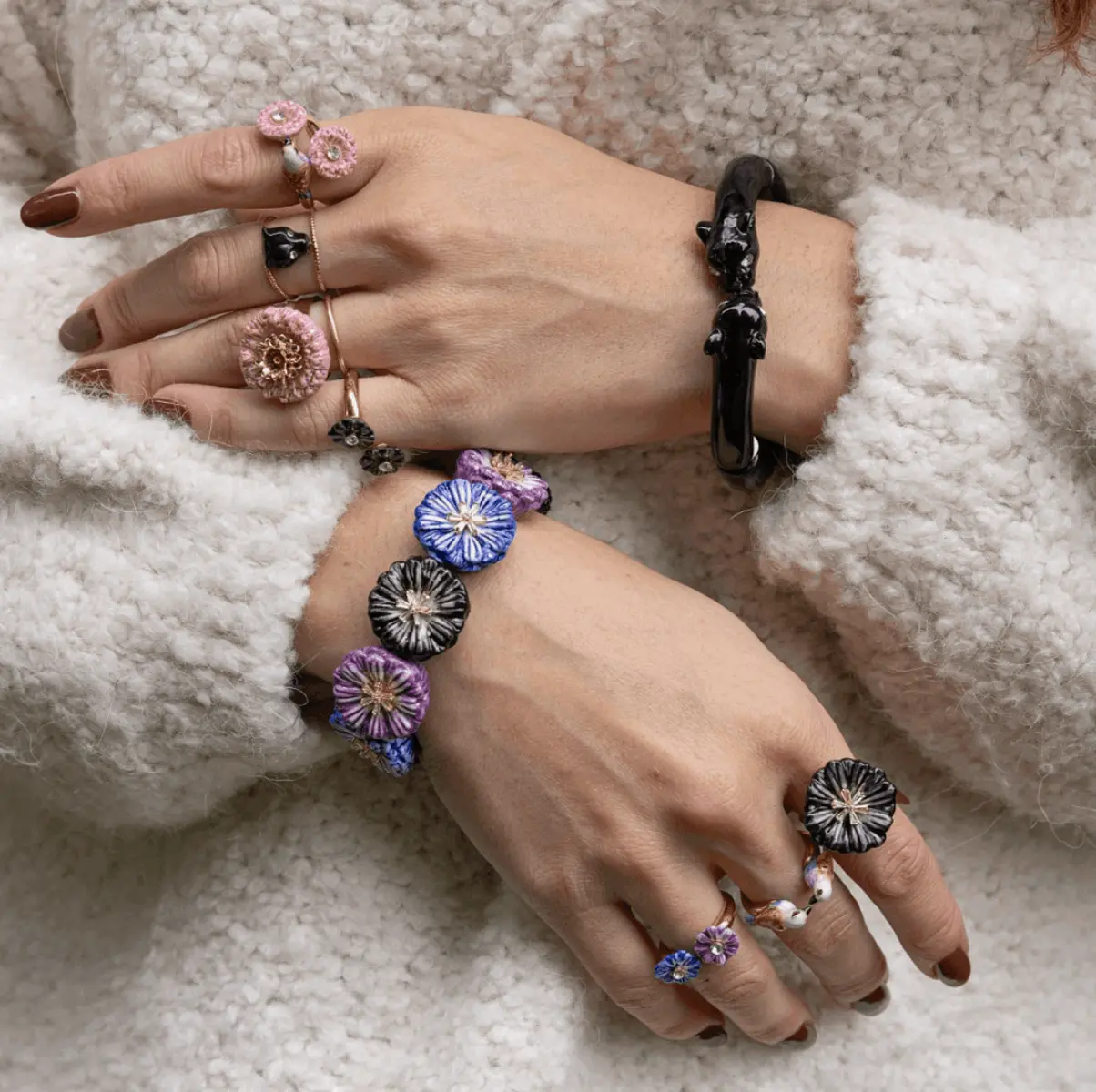NACH Bijoux transforms porcelain into wearable works of art. Each hand-painted piece is a tribute to nature and wildlife. The new collection takes inspiration from lush botanical motifs and animal forms, offering necklaces, rings, and earrings that captivate with their originality. These colourful, refined jewels add a touch of extravagance to cosy outfits, making every detail a conversation starter.